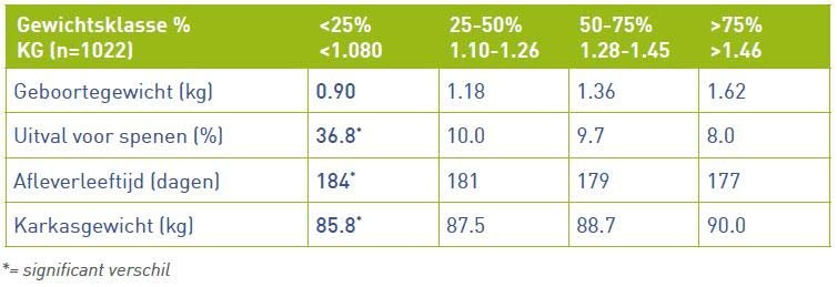 Verder is er een sterk verband tussen het gewicht bij geboorte en de uitval voor spenen. Duidelijk is ook het effect van het geboortegewicht op het aantal dagen tot aan de slacht (zie figuur 2).