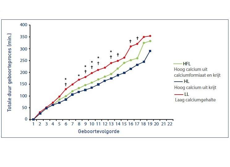 Zij hebben beide een positief effect op de snelheid van het geboorteproces. Hoe korter het geboorteproces, des te lager het risico van een zuurstoftekort bij de big en des te vitaler de big. Figuur 1 toont de resultaten van een proef van ForFarmers waarin de invloed van verschillende calciumgehalten en calciumbronnen op de duur van het geboorteproces werd onderzocht