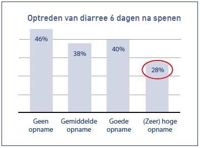 Dit heeft een positieve invloed op het speengewicht. In de kraamstal is het belangrijk dat de biggen voor het spenen voldoende vast voer opnemen. Als de voeropname van de spenen hoog genoeg is, is er minder risico op diarree na het spenen. Zo bleek uit ons onderzoek (zie figuur 3).