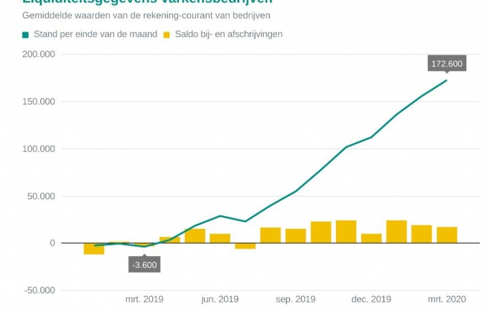 De liquiditeitsmonitor gebaseerd op data van Wageningen Economisch Research toont verdere verbetering. De rekening-courantpositie van het gemiddelde varkensbedrijf verbeterde in het eerste kwartaal van 2020 met ruim 60.000 euro. Eind maart is dat 173.000 euro. Daarmee komt de sector uit op het hoogste niveau in jaren. De marktvooruitzichten blijven gunstig, ondanks de coronacrisis.