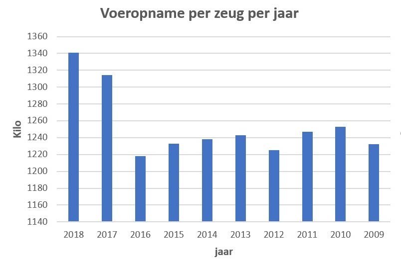 Een gemiddelde zeug is 100 kilo voer meer op gaan nemen per jaar in vergelijking met tien jaar geleden. Wel brengt ze hiermee nu ruim drie biggen per jaar meer groot. De huidige zeugengenetica in Nederland heeft gemiddeld 45 kilo zeugenvoer nodig per geproduceerde big.