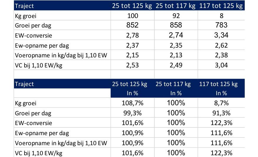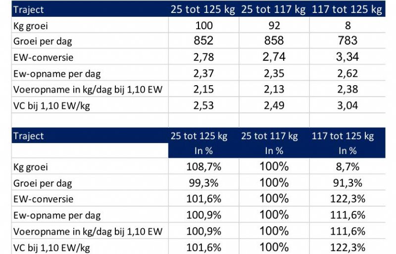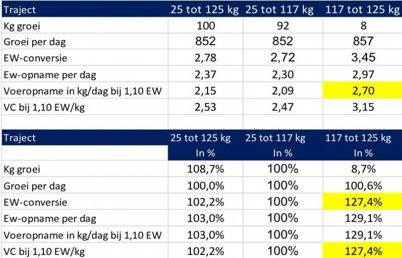 Bekker noemt het voor de hand liggend dat in de fase van 117 tot 125 kilo de voerefficiëntie afneemt. Uit de cijfers komt naar voren dat de EW- en voerconversie (VC) stijgt naar 122,3 procent van de waarde tussen 25 kilo en 117 kilo. In cijfers neemt de VC toe van 2,49 in het traject van 25 tot 117 kilo tot 3,04 in het traject van 117 tot 125 kilo.