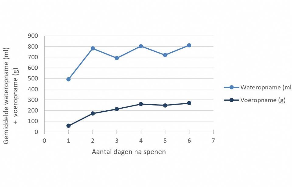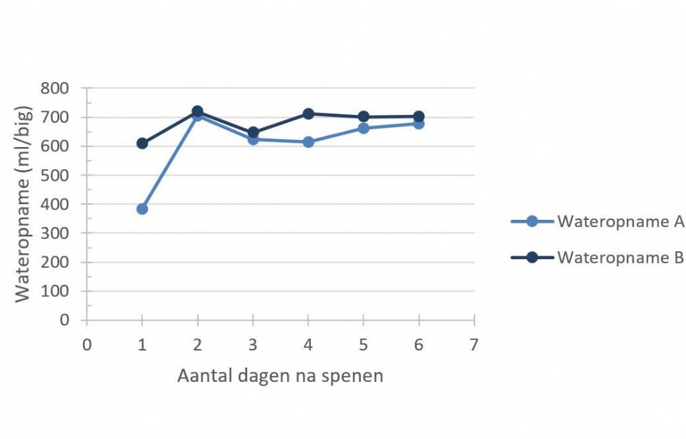 De totale wateropname in de eerste zes dagen na het spenen was 3,7 liter voor groep A en 4,1 liter voor groep B. Hierbij was het opvallend dat vooral op dag 1 de wateropname in groep B, de groep met zowel een drinknippel als een waterbak, hoger was (385 ml/big/dag vs. 610 ml/big/dag; figuur 1).