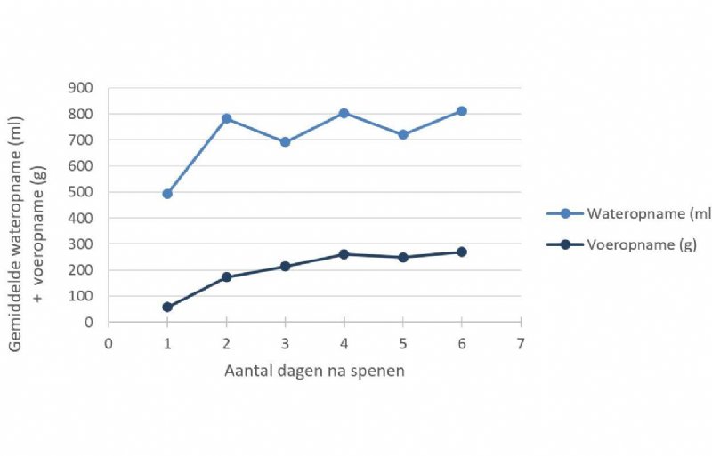 De totale wateropname in de eerste zes dagen na het spenen was 3,7 liter voor groep A en 4,1 liter voor groep B. Hierbij was het opvallend dat vooral op dag 1 de wateropname in groep B, de groep met zowel een drinknippel als een waterbak, hoger was (385 ml/big/dag vs. 610 ml/big/dag; figuur 1).
