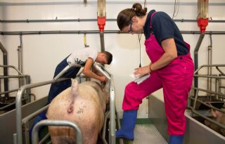 Ondertussen somt hij allerlei weetjes op over het beoordelen van de conditie van hoogdrachtige zeugen, het beenwerk, de uiervulling en vitaliteit van het dier. Ook kijkt hij goed of dieren zenuwachtig reageren. 'Rust en ontspanning zijn seinen dat de zeug zich goed voelt. Als ze stress hebben, zal het werpproces minder soepel verlopen.'