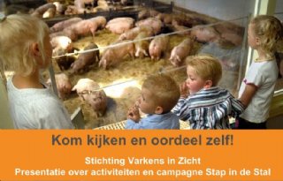 Bij de diverse plekken waar zicht is op varkens in de stallen, bij de luchtwasser en de brijvoerkeuken, staan medewerkers in groene polo’s die uitleg geven. In een van de kraamhokken achter het raam zoogt net een zeug haar biggen. Een kind roept verrukt dat de biggen aan het eten zijn. Hun moeder vraagt zo’n herkenbaar 'groenhemd' hoe oud deze biggen zijn en krijgt als antwoord twee weken en over twee weken worden ze bij hun moeder weggehaald. Dat vindt de moeder dan weer heel jong.