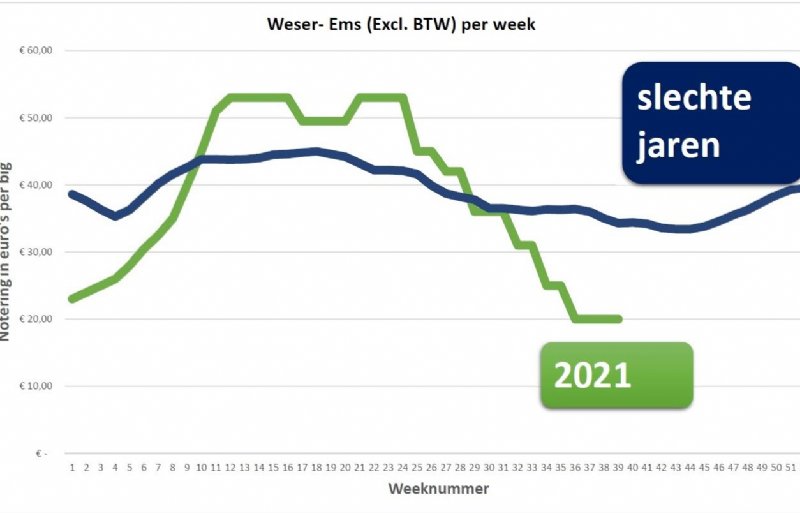 Natuurlijk kunnen we samen op basis van die 'slechte' cijfers uit het verleden geen zekerheid krijgen voor de toekomst. Uiteindelijk zijn die cijfers wel benut door de ondernemer om zijn eigen liquiditeitsprognose te maken richting de nabije toekomst. Samen hebben we de prijsnotering van die vijf magere jaren bij elkaar gevoegd en vergeleken met het verloop van de prijsnotering in dit bijzondere jaar.