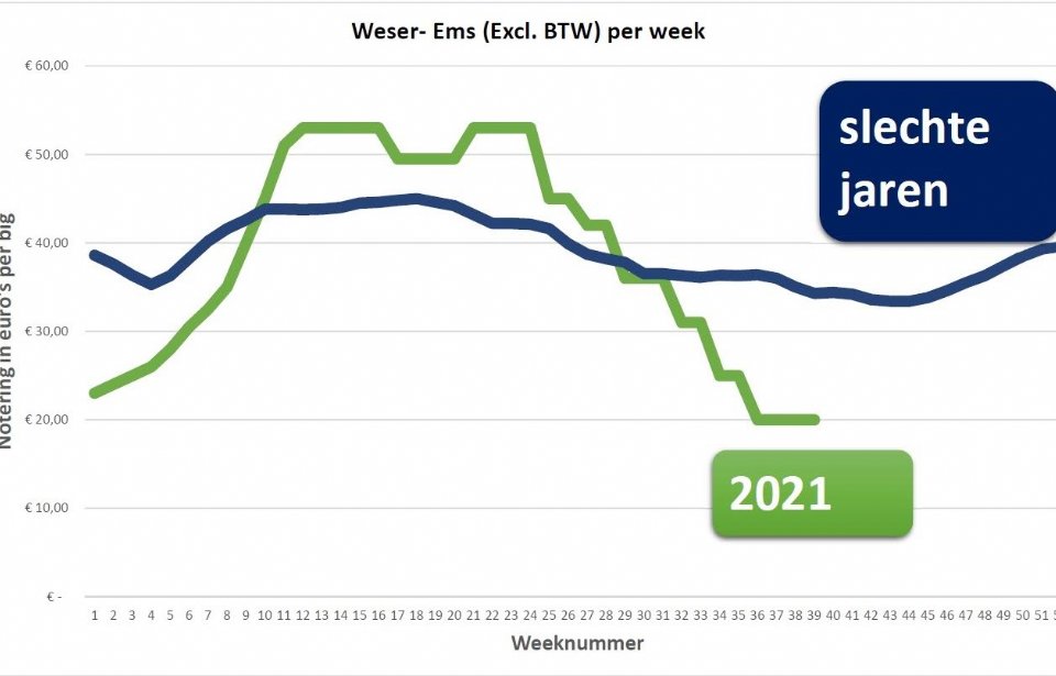 - Deze notering heeft in voorgaande slechte zeugenjaren nooit onder 25 euro per big gestaan, terwijl deze 'dipprijs' nu op 20 euro staat (20 procent lager!);