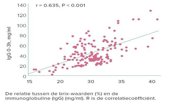 Veel beter is het om de kwaliteit van de biest te bepalen met een brixrefractometer. Met dit apparaat kunt u de kwaliteit van de biest meten aan de hand van de breking van het licht dat door de biestoplossing schijnt. De brixwaarde die dit oplevert, is gecorreleerd met de IgG, dus hoe hoger de brixwaarde van de biest, hoe meer antistoffen de biest bevat (zie figuur 2).