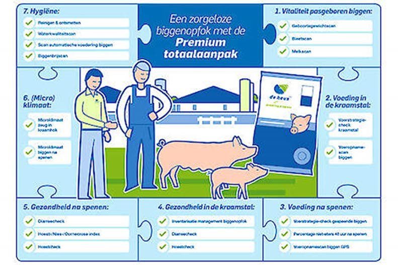 Met de Premium Totaalaanpak Biggen worden op gestructureerde wijze alle aspecten van de biggenopfok beoordeeld, van geboorte tot afleveren, en zo nodig aangepakt. Door zoveel mogelijk aspecten te meten en te vergelijken met andere bedrijven, kan in de meeste gevallen de vinger op de zere plek worden gelegd. Dat een probleemloos verlopende biggenopfok mogelijk is, bewijzen de vele tevreden klanten en ons eigen onderzoeksbedrijf de Elsenpas. Kwaliteitsbiggen met een hoge levensgroei en een goede gezondheid zijn het beste uitgangspunt voor goede prestaties in de mesterij.