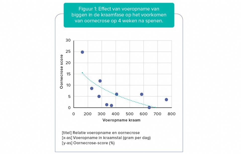 Daarnaast kan een goede voeropname voor het spenen ook mogelijke latere problemen voorkomen, zoals oornecrose (Figuur 1). Voor een hoge voeropname voor het spenen is het belangrijk om eerst hoogwaardige premium biggenvoeders in te zetten en pas over te schakelen naar aansluitend gangbaar biggenvoer zodra het kan. Daarnaast kan het gebruik van verrijkingsmateriaal, zoals deBaby Big XL de voeropname van biggen nog extra stimuleren.