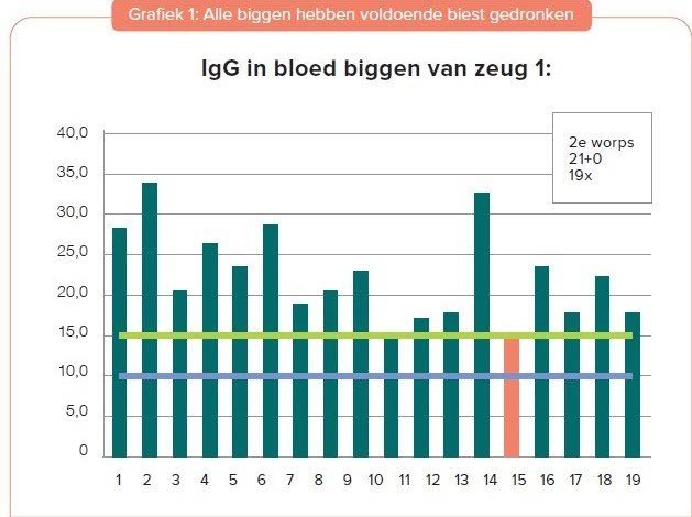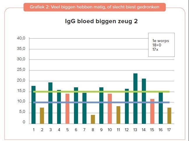 In grafiek 1 en 2 zie je de hoeveelheid antistoffen in het bloed van de biggen. Bij de ene zeug is de hoeveelheid immuunglobulinen (IgG) en de verdeling ervan veel beter dan bij de andere zeug.