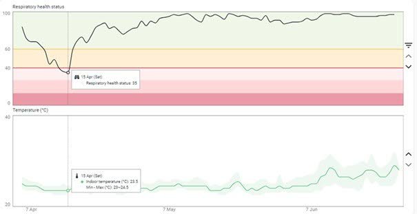 In de app is niet alleen de status van de afdeling te zien, ook de sensor die in de stal hangt verandert mee van kleur. Zo ziet de varkenshouder direct als hij de stal inloopt of er hoestgeluiden in de afdeling zijn waargenomen.
