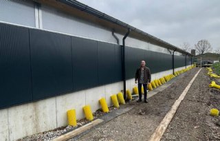 De stal was nog niet helemaal af, maar er lag al wel een koppeltje biggen in een van de hokken. Ze lagen in een laagje schoon strooisel onder een overkapping. Een droogvoerbak met zes vreetplekken kan automatisch worden gevuld met twee voersoorten. De lange dichte vloer loopt licht hellend af naar een gietijzeren roostervloer.