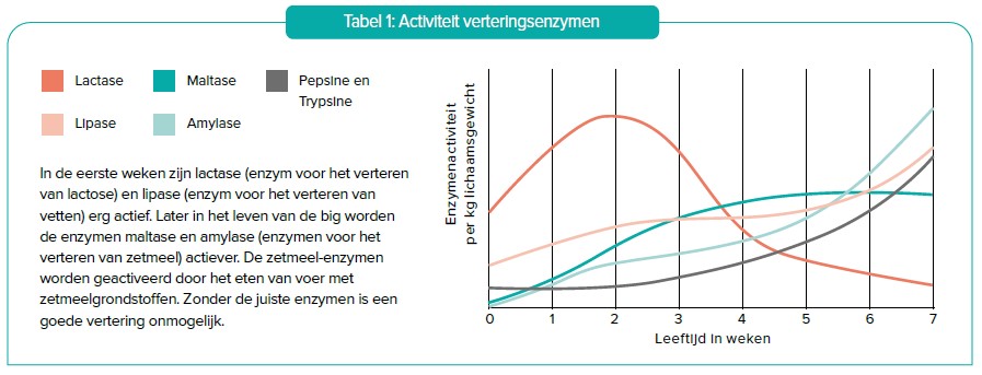Naast leren eten moeten biggen ook leren verteren. Waar ze in de kraamstal voornamelijk zeugenmelk drinken, krijgen ze na het spenen biggenvoer waar niet alleen zuivel in zit, maar ook plantaardige grondstoffen. Dat is voor de biggen een grote verandering. Vóór het spenen verteren ze voornamelijk lactose en vet en na het spenen worden er vezels en zetmeel verteerd. Door al in de kraamstal het juiste voeren te geven, zal het verteringsstelsel van de big in een vroeg stadium enzymen aanmaken die nodig zijn om de plantaardige grondstoffen goed te kunnen verteren.