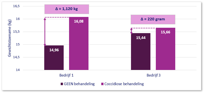 Tussen 21 en 65 dagen leeftijd was het verschil in gewichtstoename tussen behandelde en onbehandelde biggen respectievelijk 1,12 kilo en 220 gram in het voordeel van de behandelde biggen. Over de gehele periode van dag 1 tot en met 3 tot 65 dagen leeftijd wogen de behandelde biggen in bedrijf 1 en bedrijf 3 respectievelijk 1,44 kilo en 330 gram meer. Dit toont aan dat groeivertraging door coccidiose zowel voor als na het spenen optreedt en dat een coccidiosebehandeling tijdens de eerste levensdagen ook na het spenen een positief effect heeft op de groei.