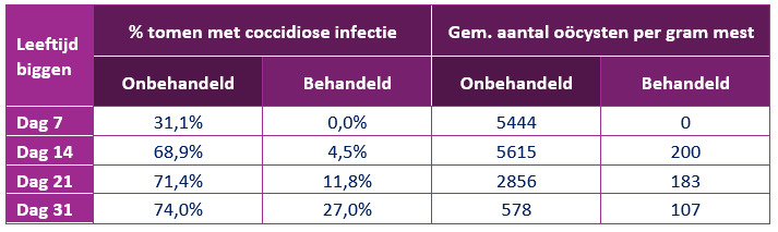 Daarnaast werden bij de onbehandelde biggen gemiddeld 5.615 oöcysten per gram mest gevonden, terwijl dit bij de behandelde biggen slechts 200 oöcysten per gram mest was. De besmettingsgraad bij de behandelde biggen was dus 28 keer lager dan bij de onbehandelde biggen. Over de gehele studieperiode hadden behandelde tomen 16,33 keer minder kans op een coccidiose-infectie dan onbehandelde tomen.