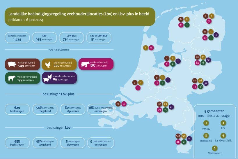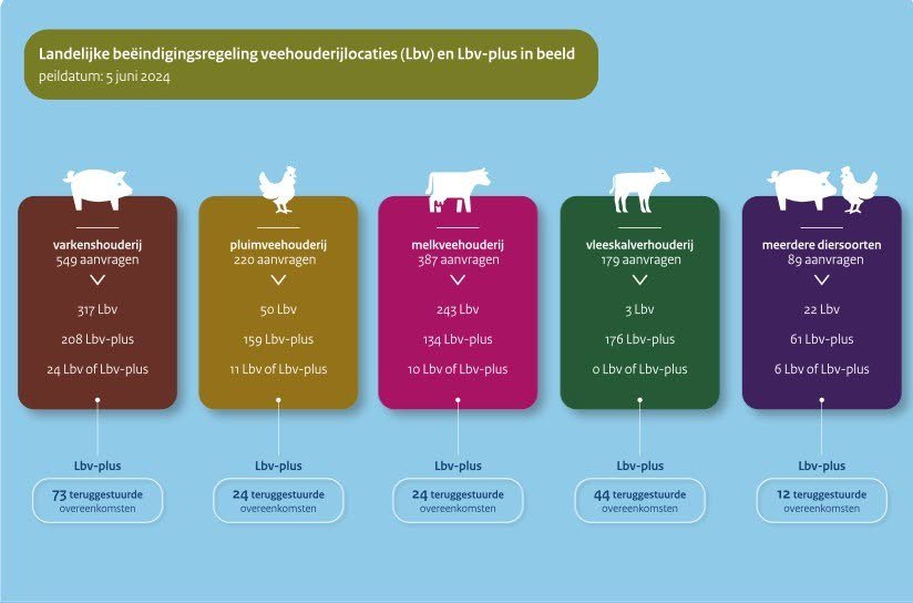 In totaal waren er bij RVO op 6 juni 1.424 veehouders die zich hebben aangemeld voor de Lbv- of Lbv-plusregeling. Aanmelden voor de Lbv-plusregeling kan nog tot en met 20 december. De Lbv-regeling is al gesloten.