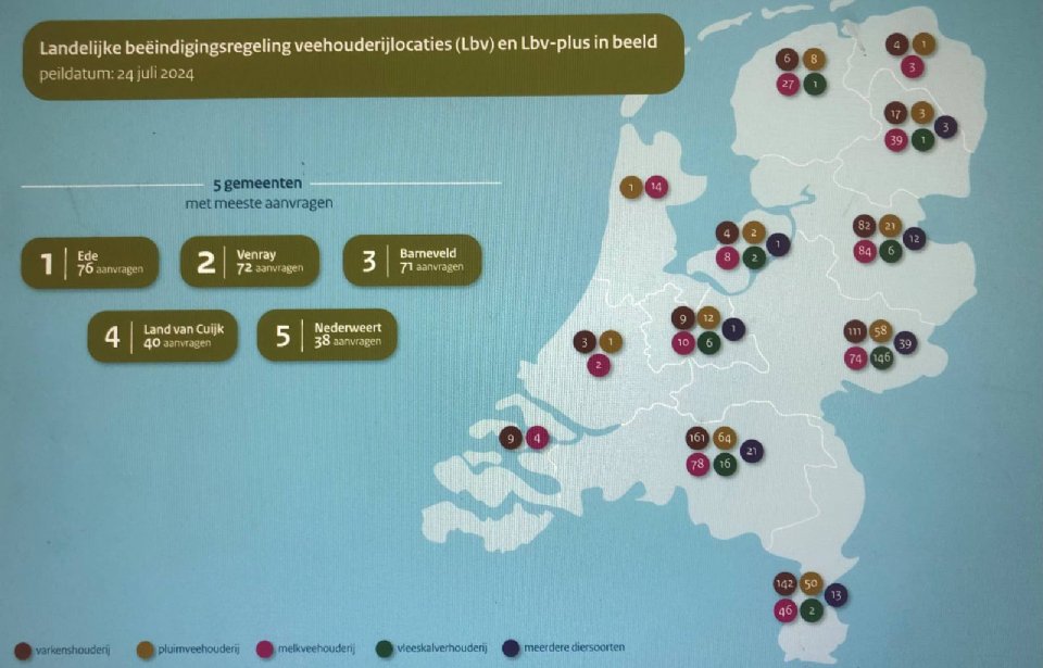 Afhankelijk van het aantal veehouders dat de beschikking ook weer instuurt, is de impact voor gemeente Ede, waar 76 van de aanvragen vandaan komt, het grootst. Na Ede volgen Venray met 72 aanvragen, Barneveld met 71 aanvragen, Land van Cuijk met 40 aanvragen en Nederweert met 38 aanvragen.