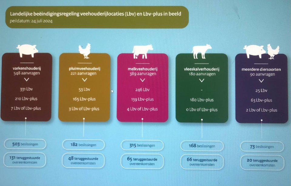 Van de 1.428 aanvragen voor de Landelijke beëindigingsregeling veehouderijlocaties (Lbv) en de Landelijke beëindigingsregeling veehouderijlocaties met piekbelasting (Lbv-plus) die de Rijksdienst voor Ondernemend Nederland (RVO) heeft ontvangen, zijn 1.241 aanvragen verwerkt. Zo'n 8 procent van de verwerkte aanvragen komt niet in aanmerking voor een van beide regelingen.