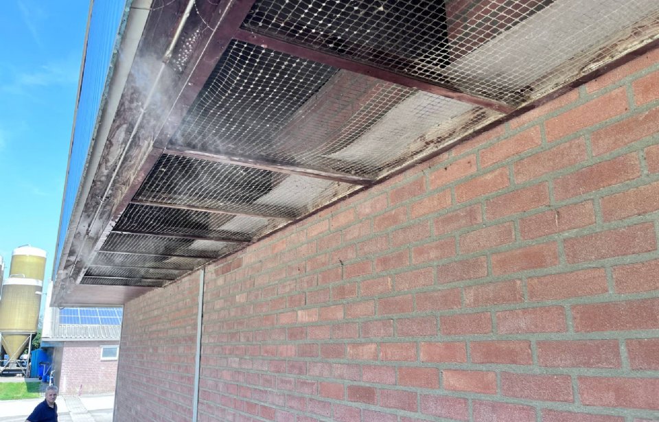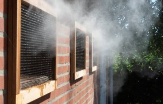 Op snikhete dagen nemen varkenshouders soms ook voor passanten zichtbare maatregelen om het voor hun dieren zo aangenaam mogelijk te maken. Bij de luchtinlaat aan de voor- en zijkant van deze stal met vleesvarkens in het Limburgse Melderslo hing vandaag een waternevel.