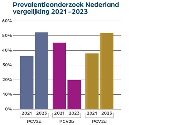 Om de vinger aan de pols te houden, volgt Zoetis in verschillende landen de verandering van het circovirus en de verschuiving in typen op varkensbedrijven op. Uit een inventariserend prevalentieonderzoek dat in 2021 in de Benelux is uitgevoerd, kwam naar voren dat PCV2d op bijna de helft van de onderzochte bedrijven voorkwam. In 2023 is dit onderzoek in Nederland herhaald en is de dominantie van het PCV2d-subtype verder toegenomen.