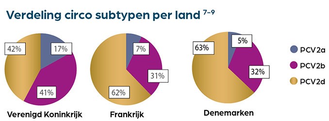 De situatie in België en Nederland staat niet op zich. Wereldwijd en ook in Europa is PCV2d inmiddels de meest voorkomende variant. In onderstaande cirkeldiagrammen is te zien hoe de verdeling van de verschillende PCV2-subtypen in de ons omringende landen is vastgesteld.