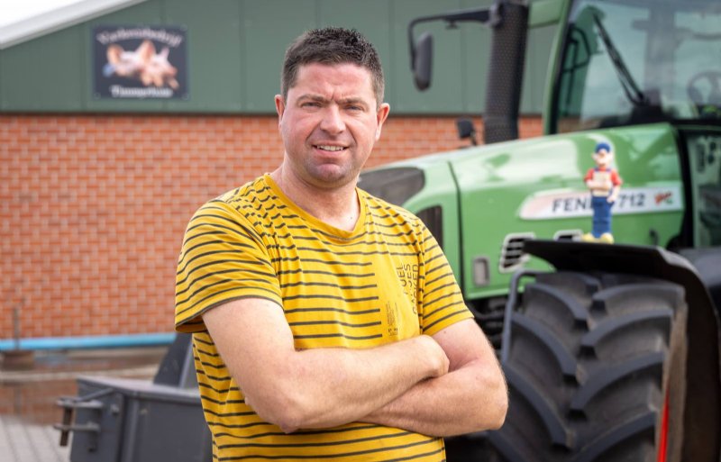 Na het lossen van een koppel biggen komt Ruud Timmerhuis uit het Overijsselse Almelo opgefrist uit de omkleedruimte. Elke week rijdt de houder van 3.800 vleesvarkens met zijn trekker en veewagen naar zijn vaste vermeerderaar 15 kilometer verderop om een koppel biggen op te halen. Tijdens het laden van vrijwel uitsluitend beerbiggen let hij op de kwaliteit en bespreekt hij eventuele bijzonderheden.