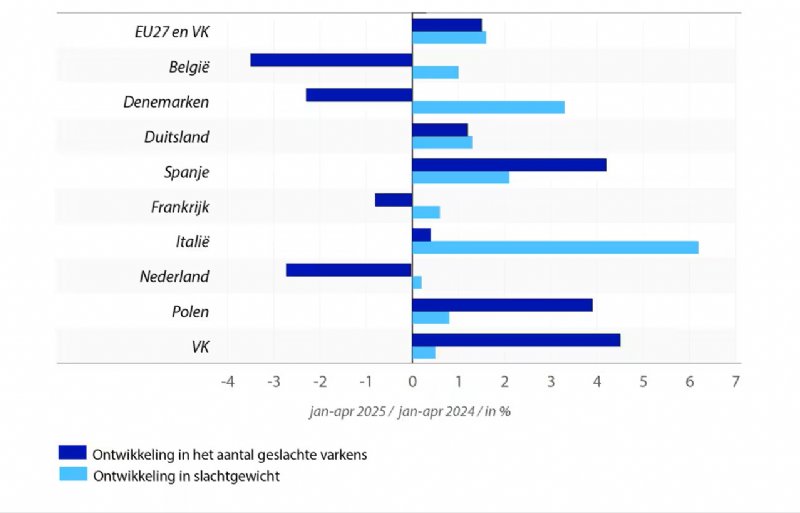 In de 27 landen van de Europese Unie samen met het Verenigd Koninkrijk (EU27+VK) is de zeugenstapel in 2024 met 3,4 procent gekrompen. Het aantal geslachte vleesvarkens in de eerste vier maanden van 2025 nam nog wel met ruim 1 procent toe. In alle landen stegen de geslachte gewichten waardoor de productie toch met 3 procent toenam.