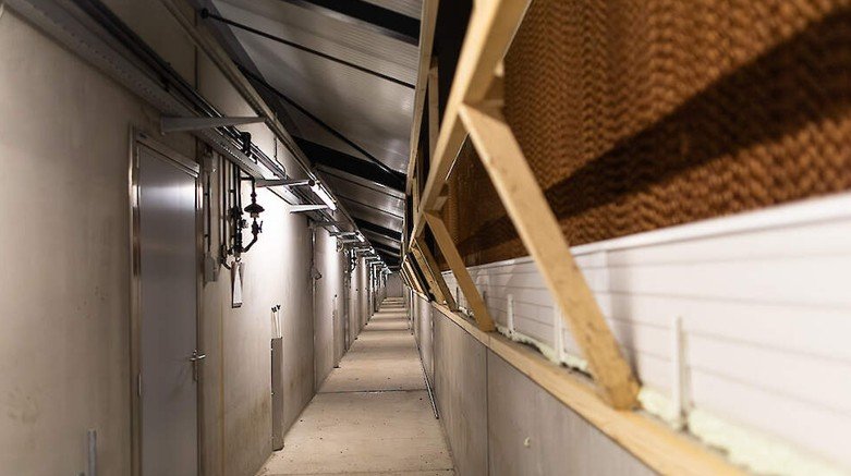 Het bedrijf staat in de polder, dus het risico op windinvloed is vrij groot. Daarom hebben ze ervoor gekozen om de luchtinlaat zo veel mogelijk weg van de standaard windrichting te bouwen. Bovendien kan de luchtinlaat makkelijk groter, of kleiner gemaakt worden. Daarnaast hanteren ze het boekenkastsysteem, ook weer om overdruk door de wind te voorkomen. De lucht kan in de zomer gekoeld worden met een PAD-koeling met papierelementen. Deze kan relatief efficiënt en goedkoop koelen, zonder dat de luchtvochtigheid hoog wordt.